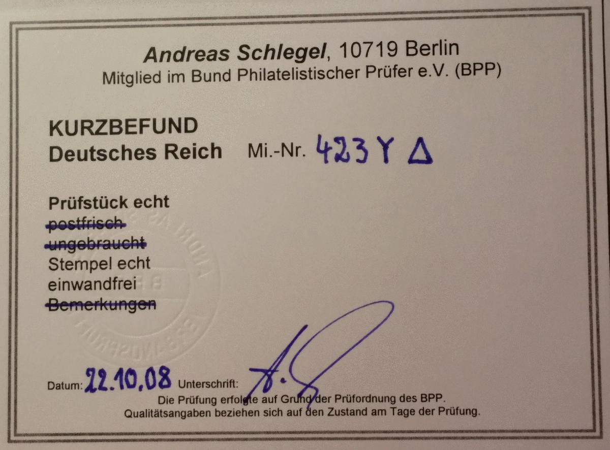 | Prüfer: | Schlegel, Andreas (BPP (Bund Philatelistischer Prüfer)) |