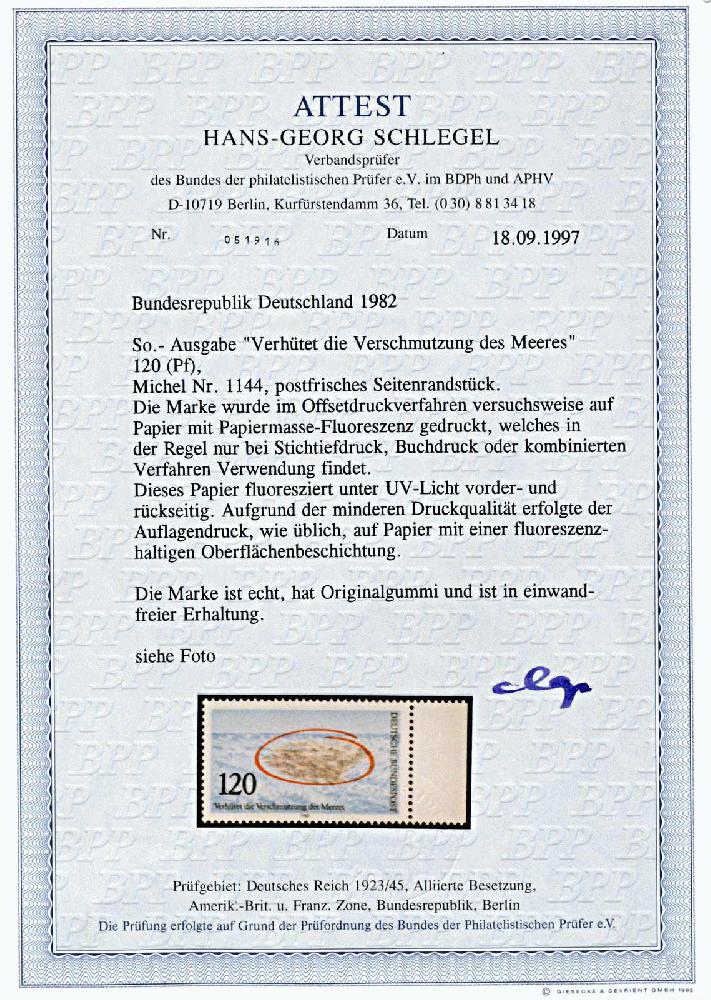 | Zusatzinformationen und Suchstichworte: | 185. Dresdner Briefmarken Auktion 21.-22. September 2022 Los 2418 Bundesrepublik Deutschland 120 Pfg. Probedruck auf vorder- und rückseitig gelb fluoreszierendem Papier, postfrisch, Attest vom 18.9.97 "echt und einwandfrei" Schlegel BPP (150,-) Zuschlag 55,00 EUR |