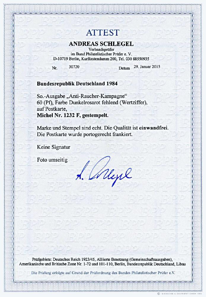 | Zusatzinformationen und Suchstichworte: | 185. Dresdner Briefmarken Auktion 21.-22. September 2022 Los 2419 Bundesrepublik Deutschland Anti-Raucher-Kampagne. 60 Pfg., Farbe Dunkelrosarot fehlend (Wertziffer), auf Postkarte, Attest vom 29.1.15 "echt und einwandfrei" Schlegel BPP (250,-) Zuschlag 230,00 EUR |
