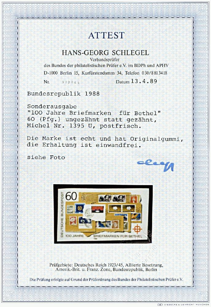 | Zusatzinformationen und Suchstichworte: | 185. Dresdner Briefmarken Auktion 21.-22. September 2022 Los 2422 Bundesrepublik Deutschland Briefmarken für Bethel. 100 Pfg. ungezähnt, postfrisch, Attest vom 13.4.89 "echt und einwandfrei" Schlegel BPP (500,-) Zuschlag 140,00 EUR |