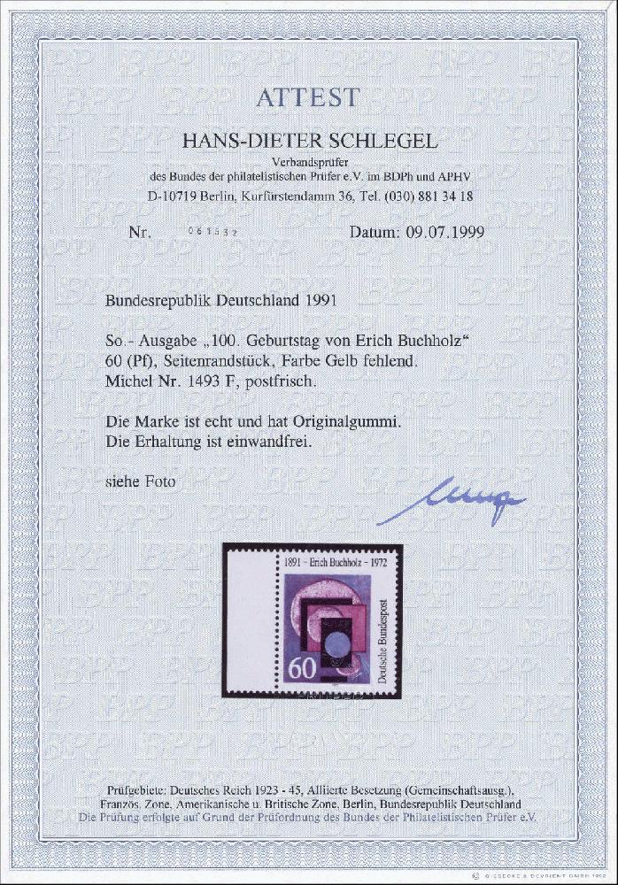 | Zusatzinformationen und Suchstichworte: | 185. Dresdner Briefmarken Auktion 21.-22. September 2022 Los 2429 Bundesrepublik Deutschland E. Buchholz. 60 Pfg., Farbe Gelb fehlend, vom linken Rand, postfrisch, Attest vom 9.7.99 "echt und einwandfrei" Schlegel BPP (250,-) Zuschlag 80,00 EUR |