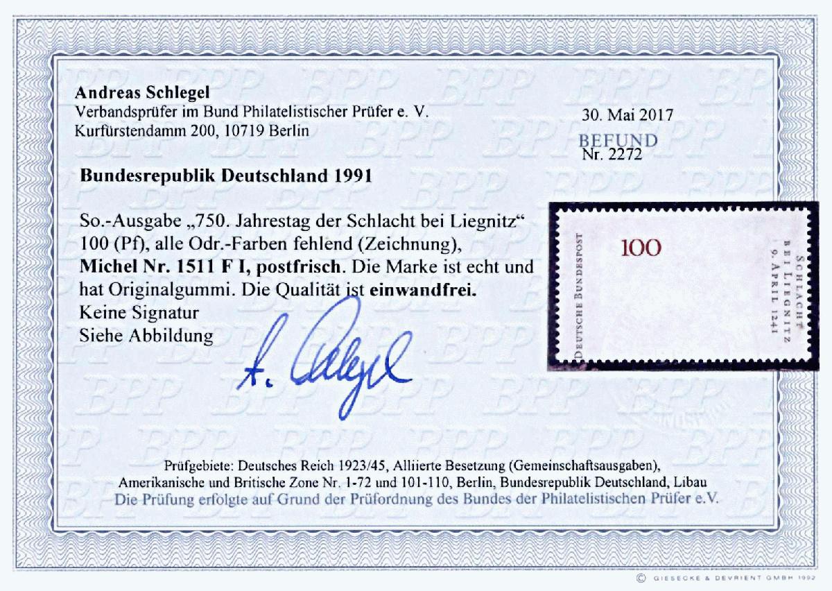 | Zusatzinformationen und Suchstichworte: | 185. Dresdner Briefmarken Auktion 21.-22. September 2022 Los 2430 Bundesrepublik Deutschland Schlacht bei Liegnitz. 100 Pfg., alle Odr.-Farben fehlend, postfrisch, Befund vom 30.5.17 "echt und einwandfrei" Schlegel BPP (250,-) Zuschlag 100,00 EUR |