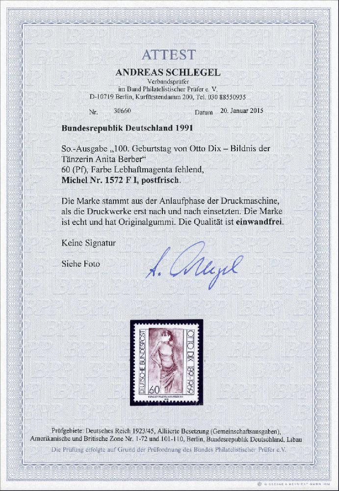 | Zusatzinformationen und Suchstichworte: | 185. Dresdner Briefmarken Auktion 21.-22. September 2022 Los 2434 Bundesrepublik Deutschland Otto Dix. 60 Pfg., Farbe Lebhaftmagenta fehlend, postfrisch, Attest vom 20.1.15 "echt und einwandfrei" Schlegel BPP (150,-) Zuschlag 46,00 EUR |