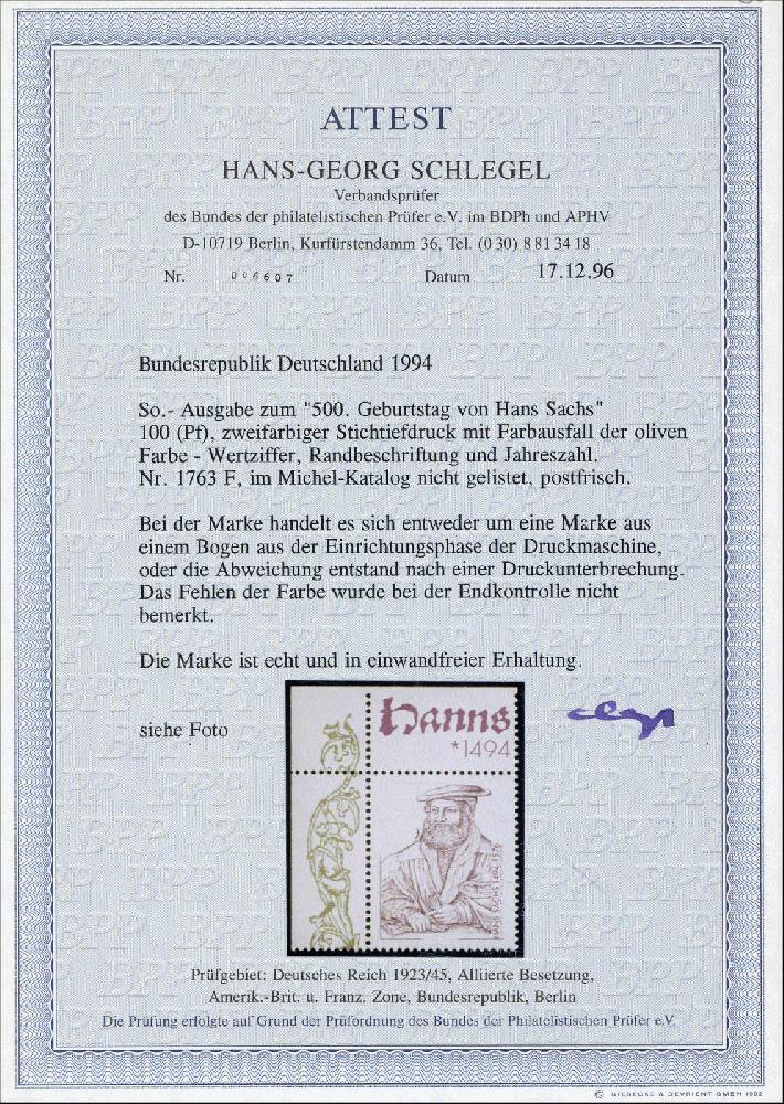 | Zusatzinformationen und Suchstichworte: | 185. Dresdner Briefmarken Auktion 21.-22. September 2022 Los 2444 Bundesrepublik Deutschland Hanns Sachs. 100 Pfg., Farbe Braunoliv (Wertangabe Randbeschriftung und Jahreszahl) fehlend, aus linker oberer Bogenecke, postfrisch, Attest vom 17.12.96 "echt und einwandfrei" Schlegel BPP (120,-) Zuschlag 44,00 EUR |