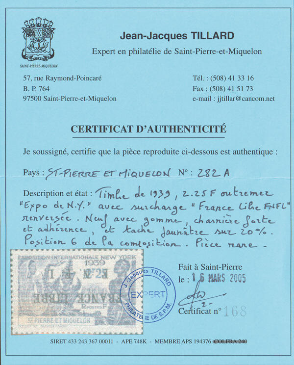 | Zusatzinformationen und Suchstichworte: | Kelleher 774. Auktion 13. - 16. September 2022 Los 2605 St. Pierre et Miquelon 1942,2,25 Fr. N. Y. Weltausstellung, "Frankreich Libre/F. N. F. L. " Überdruck kopfstehend (Scott 257 Abart), Position 6, Originalgummi; leicht getönt in einer Ecke, ansonsten Pracht, signiert Tillard, mit seinem 2005 P. F. Attest. Yvert 282A. Yvert € 2,200 ($2,470). Zuschlag 325,00 USD |