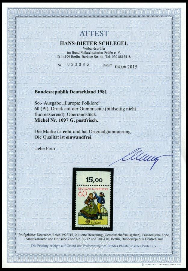 | Zusatzinformationen und Suchstichworte: | nordphila 487. Briefmarkenfernauktion 10. Oktober 2022 Los 3447 Bundesrepublik Deutschland 1982, 60 Pf. "EUROPA: Folklore", Druck auf der Gummiseite (bildseitig nicht fluoreszierend), Oberrandstück, postfrisch, Pracht, Fotoattest H.D. Schlegel Ausruf 450,00 EUR |