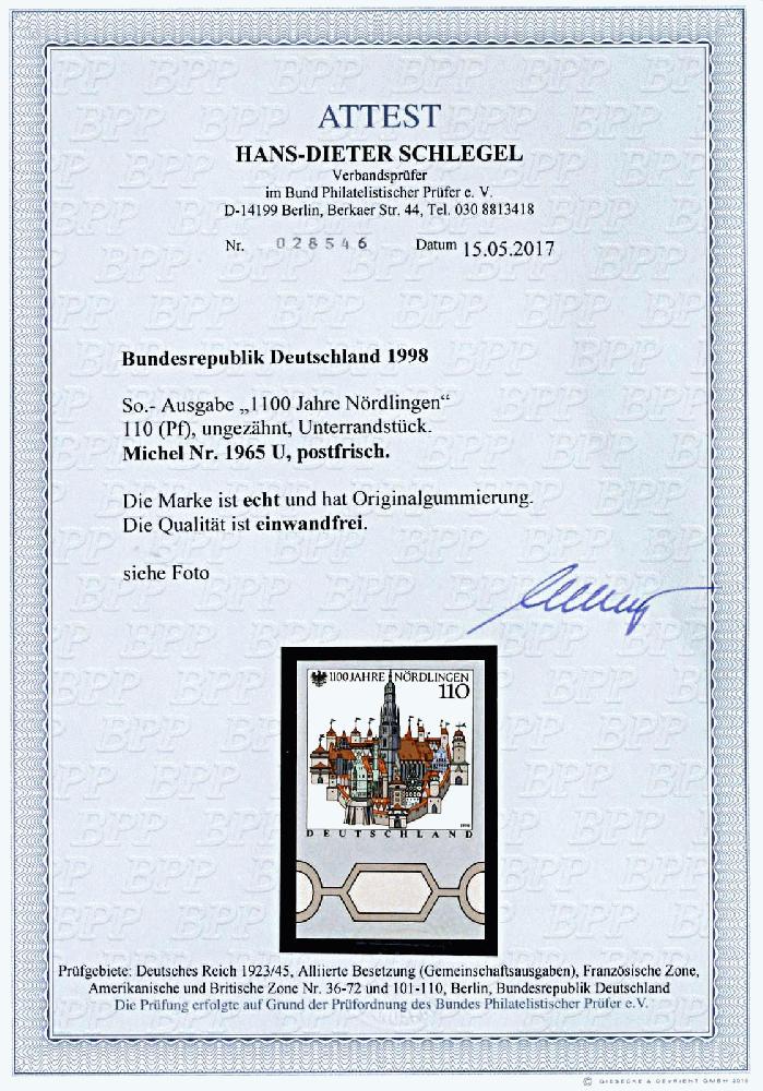 | Zusatzinformationen und Suchstichworte: | 185. Dresdner Briefmarken Auktion 21.-22. September 2022 Los 2458 Bundesrepublik Deutschland Nördlingen. 110 Pfg. ungezähnt, postfrisch, Attest vom 15.5.17 "echt und einwandfrei" Schlegel BPP (250,-) Zuschlag 65,00 EUR |