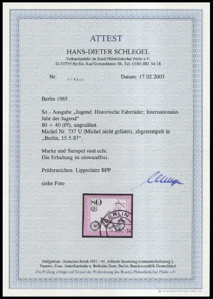 | Zusatzinformationen und Suchstichworte: | DBA Freiburg GmbH Los 1021200095 Berlin 1985, 80+40 Pfg. Jugendmarke "Jaray-Rad" mit der markanten Abart "fehlende Farbe Gelb und Braun sowie vollständig ungezähnt" in gestempelter Luxuserhaltung. Geprüft Lippschütz BPP und Farbfotoattest Schlegel BPP in der höchsten Qualitätsstufe "echt und einwandfrei". Im Michel- Spezial 2021 ohne Preisnotierung! (ME -.-) Festpreis 2.800,00 EUR |