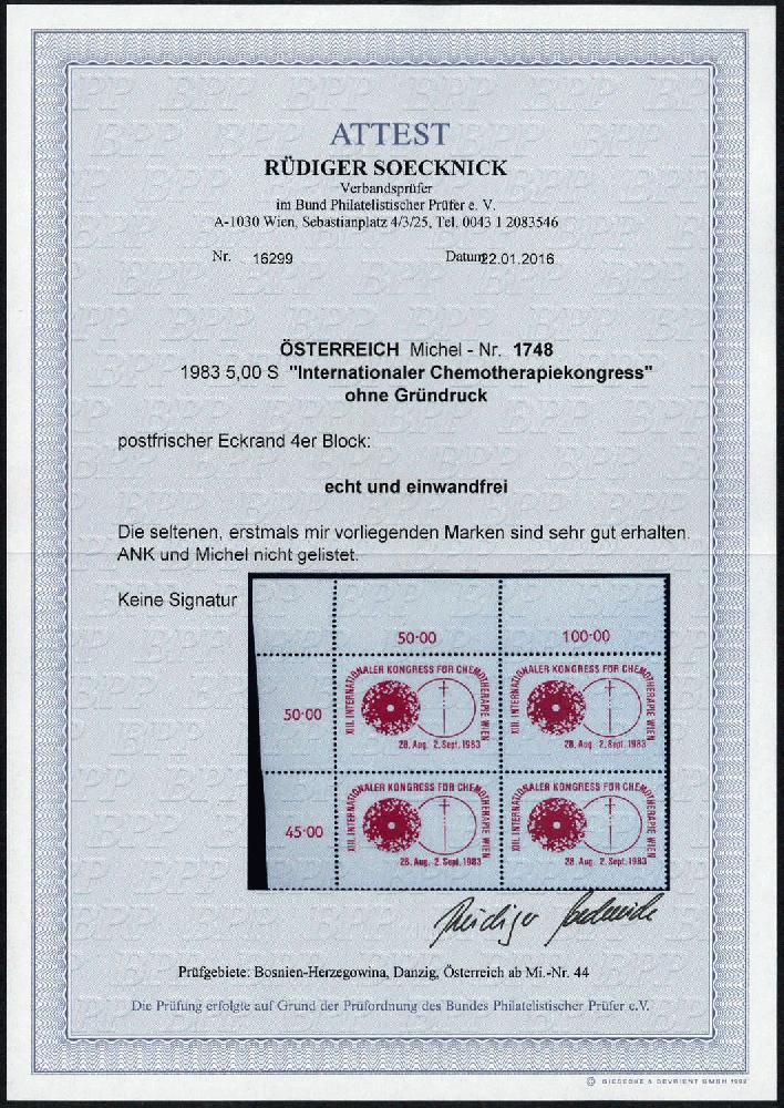 | Zusatzinformationen und Suchstichworte: | DBA Freiburg GmbH Los 1444400215 Österreich 1983, 5 Schilling Chemotherapiekongress als postfrischer Luxus- Eckrand 4-er Block links oben mit der äußerst dekorativen Abart bei allen Marken "fehlende Farbe dunkelsmaragdgrün". Aktuelles Farbfotoattest Soecknick BPP vom 22.01.2016 in der höchsten Qualitätsstufe "echt und einwandfrei" (ME Österreich Spezial 2019 = 7.200.- Euro) Festpreis 3.500,00 EUR |