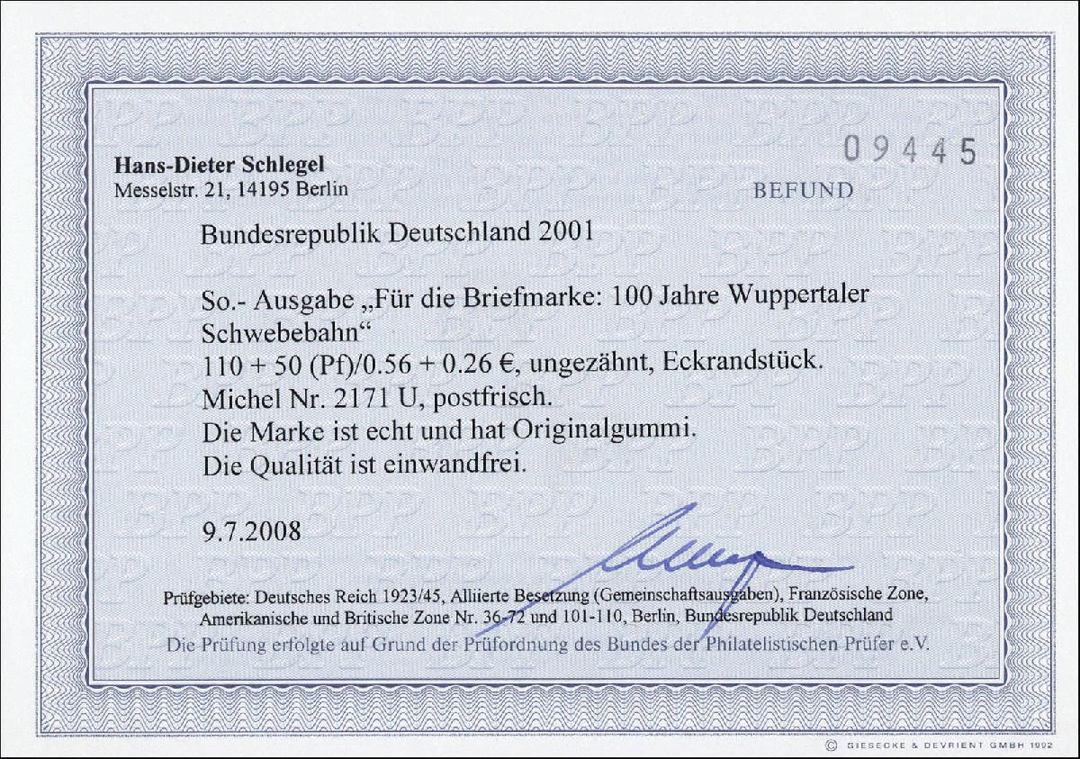 | Zusatzinformationen und Suchstichworte: | 185. Dresdner Briefmarken Auktion 21.-22. September 2022 Los 2466 Bundesrepublik Deutschland Wuppertaler Schwebebahn. 100 Pfg. ungezähnt aus linkem unteren Kleinbogen, postfrisch, Befund vom 9.7.08 "echt und einwandfrei" Schlegel BPP (200,-) Zuschlag 70,00 EUR |