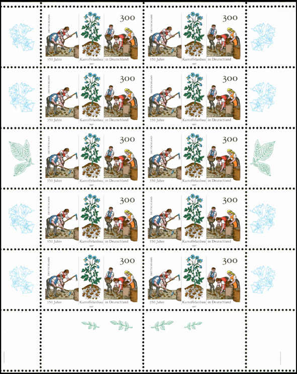 | Zusatzinformationen und Suchstichworte: | 185. Dresdner Briefmarken Auktion 21.-22. September 2022 Los 2452 Bundesrepublik Deutschland 350 Jahre Kartoffelanbau in Deutschland im Kleinbogen, markante Verzähnung, dadurch unten zwei Felder in Markengröße mit Bogenrandbedruckung, postfrisch, Befund vom 1.10.04 "einwandfrei" Schlegel BPP Zuschlag 60,00 EUR |