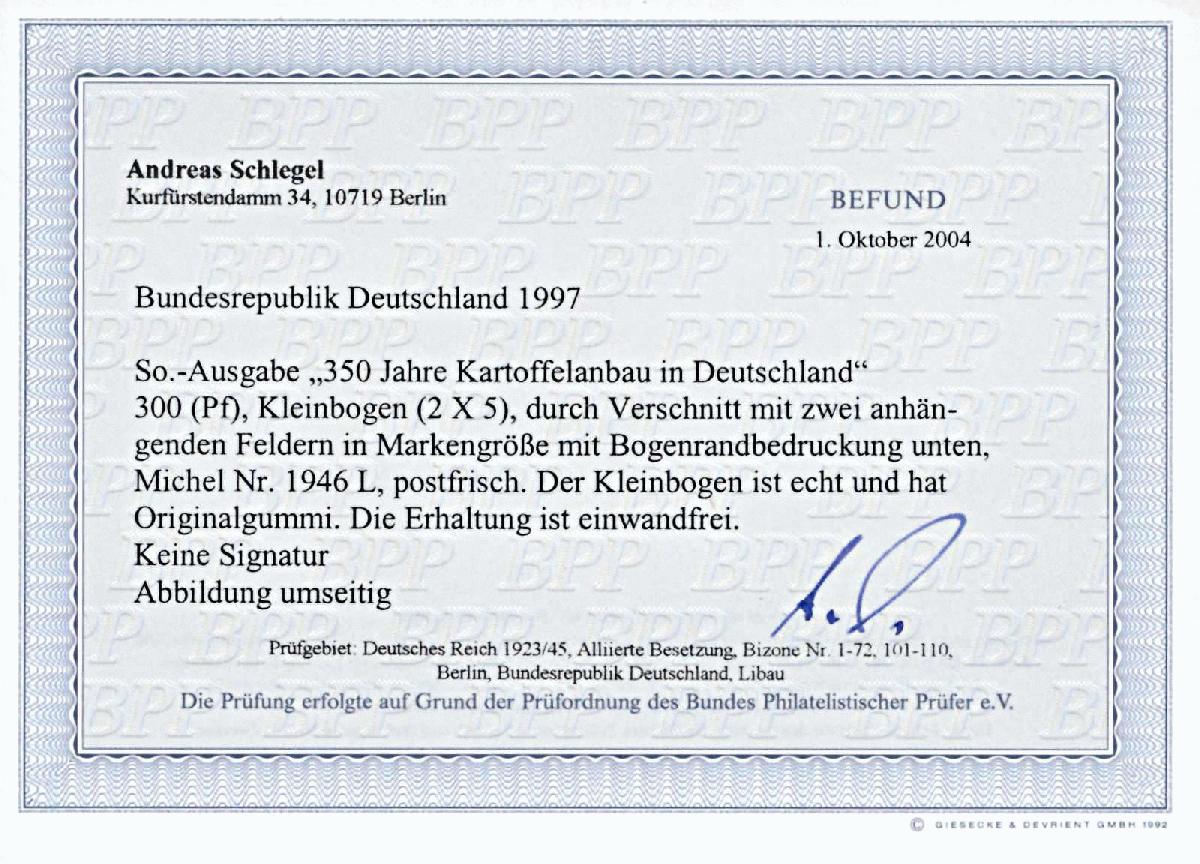 | Prüfer: | Schlegel, Andreas (BPP (Bund Philatelistischer Prüfer)) |