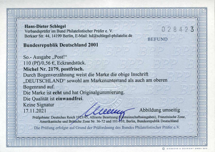| Prüfer: | Schlegel, Hans-Dieter (BPP (Bund Philatelistischer Prüfer)) |