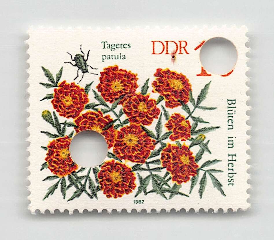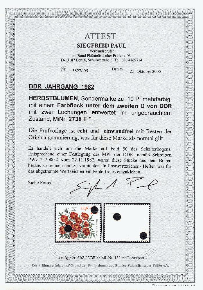 | Zusatzinformationen und Suchstichworte: | Alexander Voigt - Briefmarken und Postgeschichte Auktion 10. Oktober 2022 1982, 10 Pf., Herbstblumen, FEHLDRUCK: "Farbfleck unter dem zweiten D von DDR", entwertet mit zwei Lochungen. Fotoattest Paul BPP: "echt und einwandfrei mit Resten der Originalgummierung, was für diese Marke als normal gilt. Es handelt sich um die Marke auf Feld 50 des Schalterbogens. Entsprechend einer Festlegung des MPF der DDR, [...] waren diese Stücke aus dem Bogen herauszutrennen und zu vernichten." Ausruf 100,00 EUR |