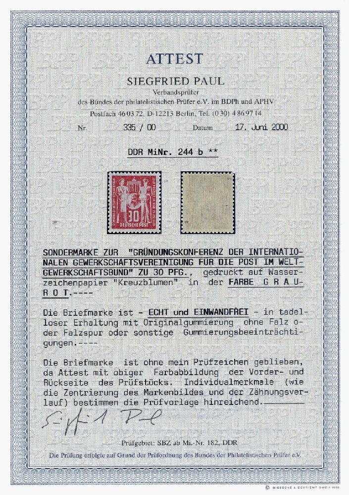 | Zusatzinformationen und Suchstichworte: | Briefmarken Fischer Shop Los 0000116707 DDR 30 Pf. Weltgewerkschaft, ** Stück in b-Farbe, Attest Paul "echt, einwandfrei" Festpreis 100,00 EUR |