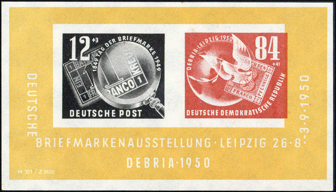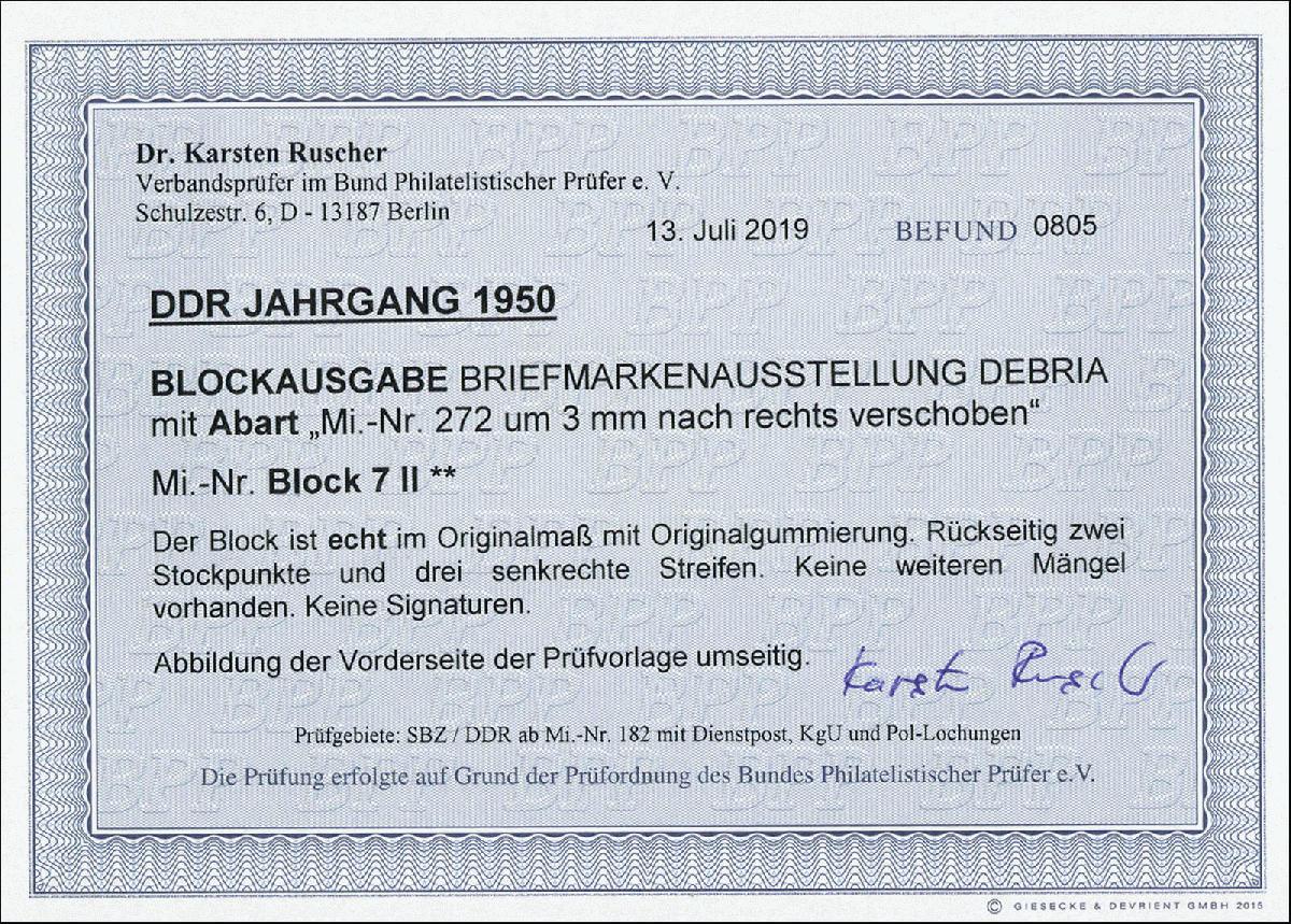 | Zusatzinformationen und Suchstichworte: | 185. Dresdner Briefmarken Auktion 21.-22. September 2022 Los 3515 DDR DEBRIA-Block 1950 mit Abart "MiNr. 272 um 3 mm nach rechts verschoben", postfrisch, Befund vom 13.7.19 "Rückseitig zwei Stockpunkte und drei senkrechte Streifen." Dr. Ruscher BPP (900,-) Zuschlag 100,00 EUR |