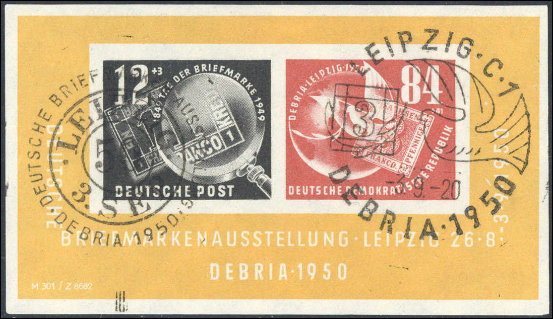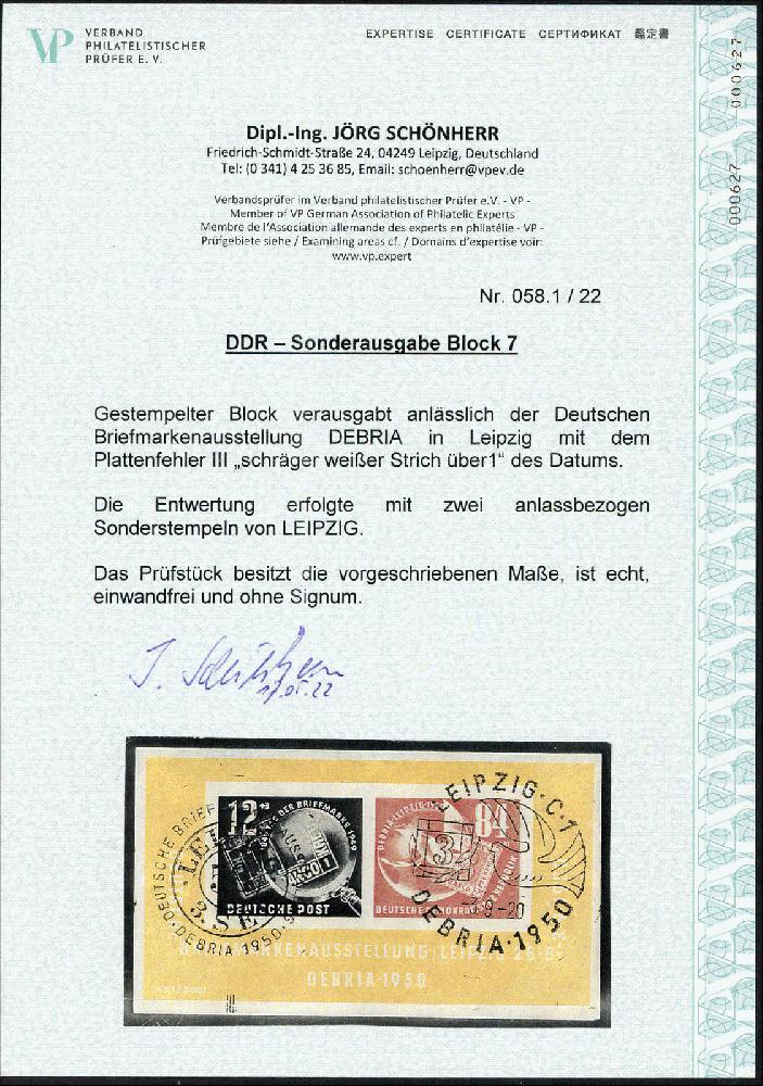 | Zusatzinformationen und Suchstichworte: | 185. Dresdner Briefmarken Auktion 21.-22. September 2022 Los 3518 DDR DEBRIA-Block 1950 mit PF "schräger weißer Strich über der 1 des Datums ", zwei SoSt., Expertise Schönherr VP (500,-) Ausruf 80,00 EUR |