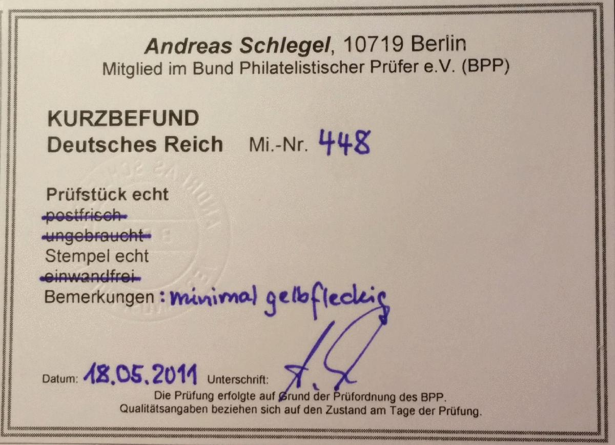 | Prüfer: | Schlegel, Andreas (BPP (Bund Philatelistischer Prüfer)) |