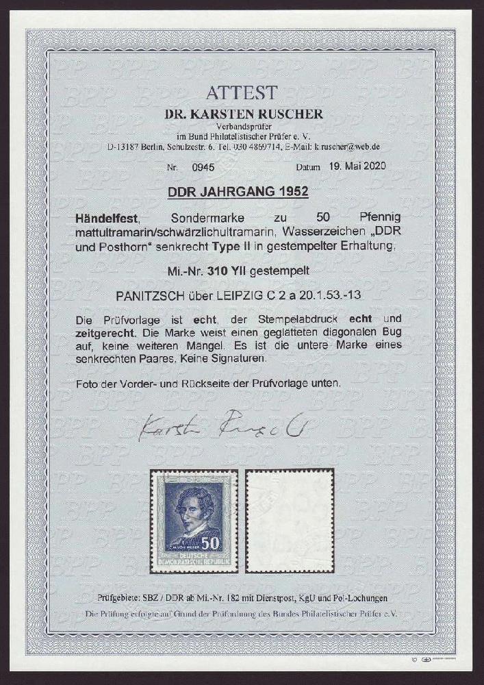 | Zusatzinformationen und Suchstichworte: | Christian E. Geigle Briefmarkenfachhandel Los 0004046692 DDR 1952, Berühmte Komponisten, 50 Pf. mattultramarin/schwärzlichultramarin mit dem seltenen Wasserzeichen 2 Y II, Prachtstück dieser modernen Rarität mit echtem und zeitgerechtem Teilstempel "PANITSCH über LEIPZIG 20.1.53-13", farbfrisch und sehr gut gezähnt, die Marke weist einen nur mit Hilfsmitteln erkennbaren geglätteten diagonalen Bug auf, bisher sind erst einige wenige gestempelte Exemplare registriert, FA Dr. Ruscher "echt, geglätteter diagonaler Bug, keine weiteren Mängel", zusätzlich ist das ehemalige Paar abgebildet, aus dem diese Marke stammt. Festpreis 490,00 EUR |
