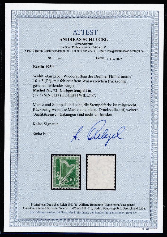 | Zusatzinformationen und Suchstichworte: | Klüttermann - 4. Auktion 28. Juli - 5. August 2022 Los 9832 Berlin 10 Pfg. Philharmonie mit der sehr seltenen Abart im Wasserzeichen "fehlender Ring", sauber gestempelt und bis auf kleine Druckstelle tadellos mit FA Schlegel (2022), Mi. gest. gar nicht gelistet und */** nur mit -,- Ausruf 1.000,00 EUR |