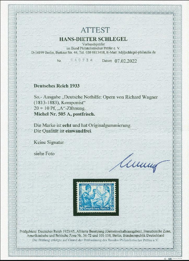 | Zusatzinformationen und Suchstichworte: | Heinrich Köhler 379. Auktion 19. - 24. September 2022 Los 2565 Deutsches Reich, 1933/45 Drittes Reich Wagner 20 Pfg. gezähnt K 14 : 13, postfrisch, tadellos, unsigniert mit Fotoatteste Schlegel BPP (1996) und D. Schlegel BPP (2022) Zuschlag 520,00 EUR |
