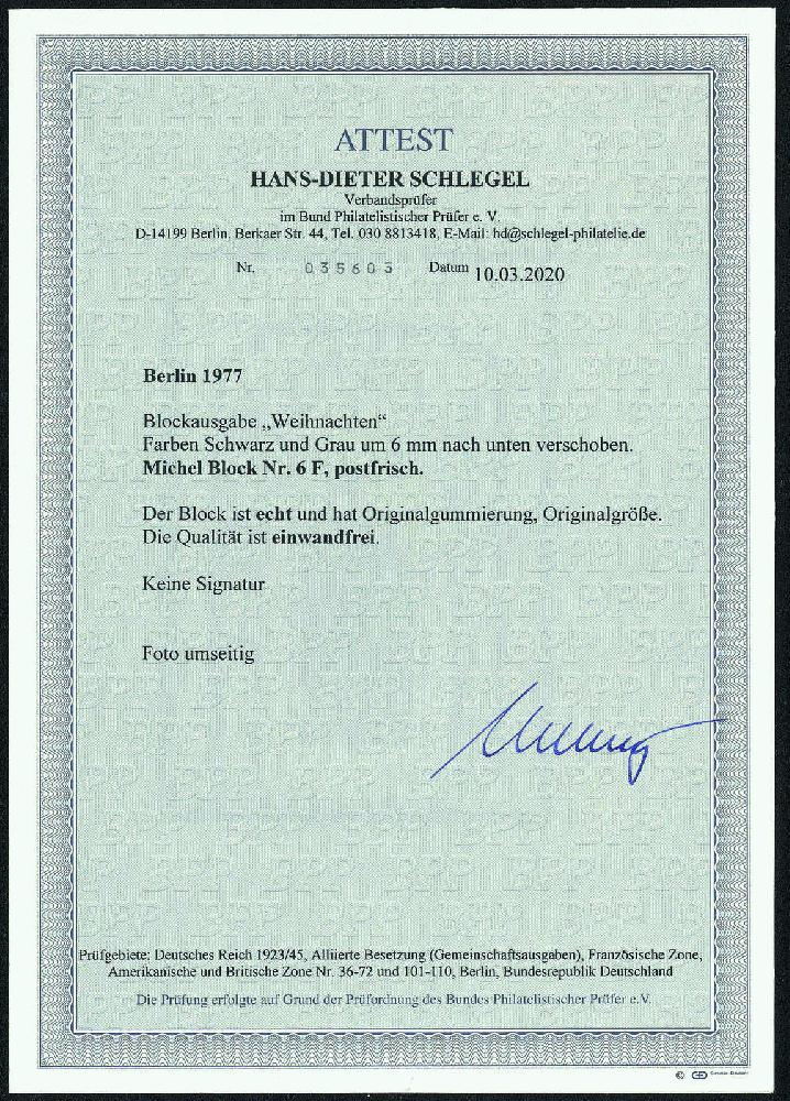 | Zusatzinformationen und Suchstichworte: | Gert Müller 115. Auktion 25. - 27. August 2022 Los 4944 Berlin Weihnachtsblock 1977 mit spektakulärer Abart "FARBEN SCHWARZ UND GRAU UM 6 MM NACH UNTEN VERSCHOBEN", farbfrisch und in voller Originalgröße, tadellos postfr. Es handelt sich hierbei um eine der seltensten Blockabarten der Nachkriegszeit, die nur in wenigen Exemplaren bekannt geworden ist. Im Michel-Katalog vollkommen unterbewertet. Ein überaus dekorativer und spektakulärer Fehldruck! Fotoattest "DIE QUALITÄT IST EINWANDFREI" Hans-Dieter Schlegel BPP Ausruf 1.500,00 EUR |