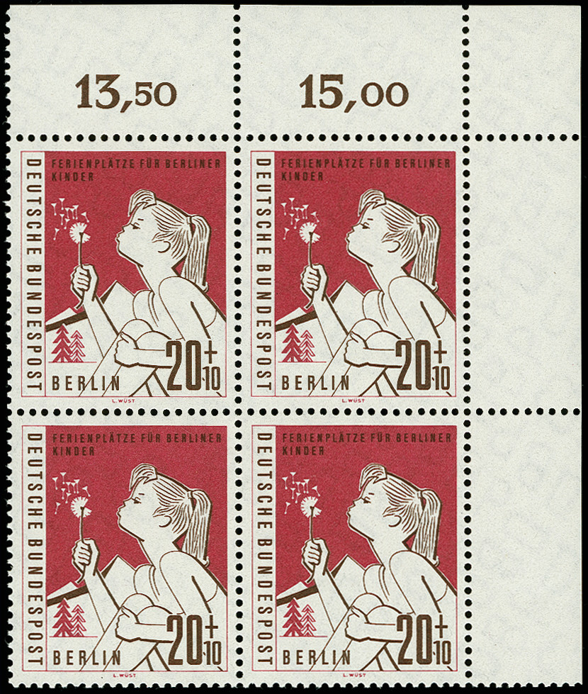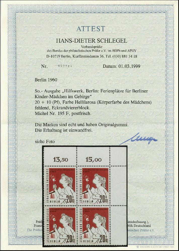 | Zusatzinformationen und Suchstichworte: | Heinrich Köhler 366. Auktion 19. - 24. März 2018 Los 2389 1960, Hilfswerk Berlin 20 Pfg. mit Abart "Farbe Hellilarosa (Körperfarbe des Mädchen) fehlend, postfrischer Viererblock aus der rechten oberen Bogenecke, postfrisch, tadellos, Fotoattest D. Schlegel BPP (1999) (Mi. 2.600,-) Zuschlag 550,00 EUR |