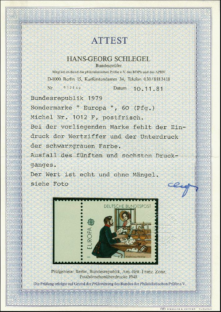 | Zusatzinformationen und Suchstichworte: | Heinrich Köhler 366. Auktion 19. - 24. März 2018 Los 2464 1979, CEPT 60 Pfg. mit Abart "Farbe Lilarot (Wertangabe) fehlt", Randstück, postfrisch, Fotoattest Schlegel BPP (1981) Zuschlag 220,00 EUR |