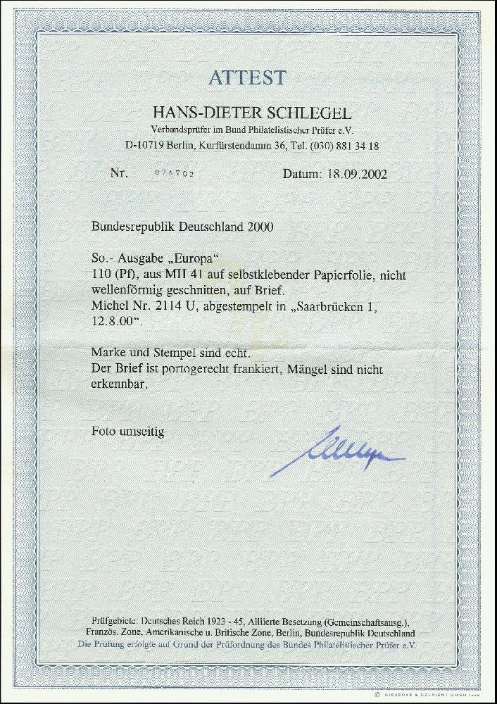 | Prüfer: | Schlegel, Hans-Dieter (BPP (Bund Philatelistischer Prüfer)) |