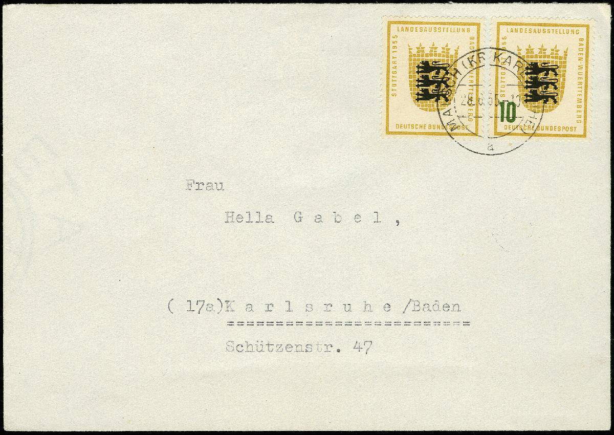 | Zusatzinformationen und Suchstichworte: | Heinrich Köhler 366. Auktion 19. - 24. März 2018 Los 2437 1955, Landesausstellung Baden-Württemberg 10 Pfg. mit fehlender Wertziffer mit Zufrankatur mit Stempel "MALSCH (Kr. KARLSRUHE) 28.6.55" auf portogerechtem Brief, tadellos, selten, Fotoattest Schlegel BPP (2017) Zuschlag 380,00 EUR |