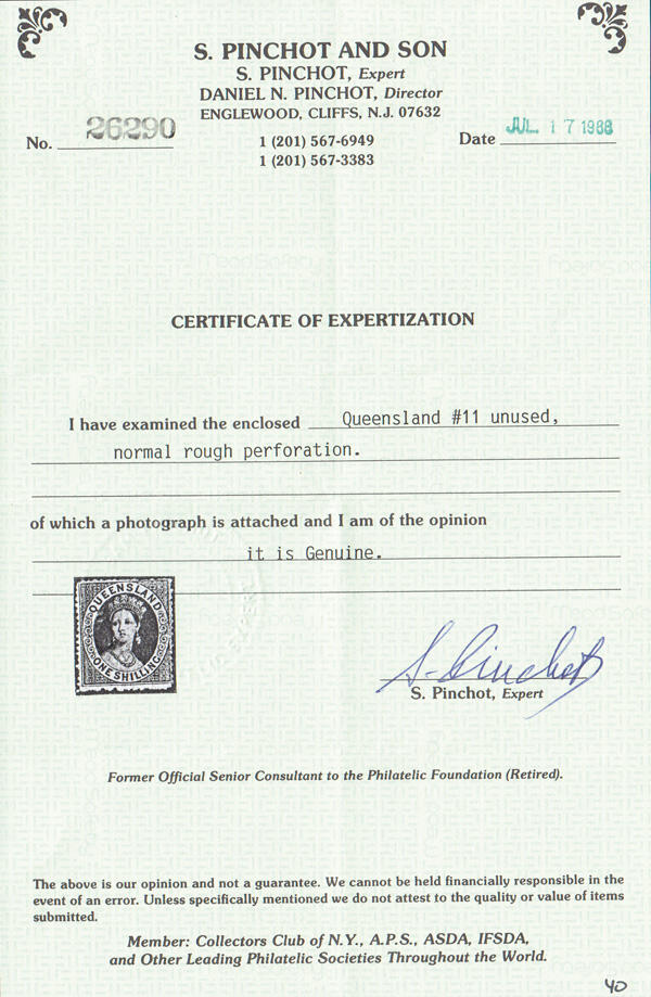 | Zusatzinformationen und Suchstichworte: | Kelleher 774. Auktion 13. - 16. September 2022 Los 2154 Queensland 1861, Königin Victoria "Chalon Kopf", 1s violett, rau gezähnt 14 zu 16 (Scott 11), kleines Stern Wasserzeichen, ungebraucht ohne Gummi, tieffarbig, fein und selten, mit ein 1988 Pinchot Attest. SG 19; £1,300 ($1,680). Scott $1,150. Zuschlag 425,00 USD |