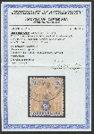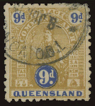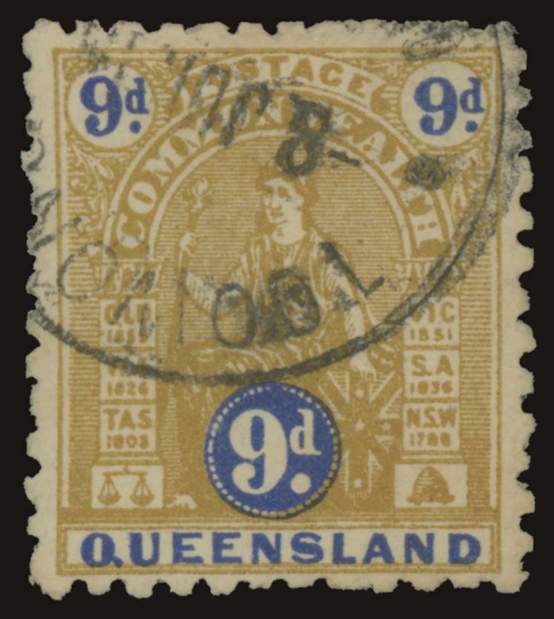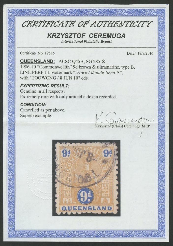 | Zusatzinformationen und Suchstichworte: | 249. Abacus Auktion 9. - 12. November 2022 Los 2323 Queensland 1906-10 'COMMONWEALTH' Perf 11 9d yellow-brown & ultramarine Type B ACSC Q45b (SG 285), well centred, 'TOOWONG' cds, Cat $1500 (SG £800). Chris Ceremuga Certificate (2016) states "extremely rare with only around a dozen recorded". The ACSC states that two of those are in the Royal Collection. [As an obvious forerunner to the country-wide Kangaroo & Map issue, this is an important and underrated stamp] Ausruf 460,00 AUD |