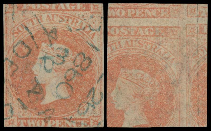 | Zusatzinformationen und Suchstichworte: | 249. Abacus Auktion 9. - 12. November 2022 Los 1050 Südaustralien TWO PENCE: 2d pale red Printed on Both Sides SG 15a with the original impression on the 'reverse' being unusually strong & orientated upright relative to the 'face', rouletting significantly misplaced so cut from the sheet to largely preserve the design, a few split roulettes, GPO cds of 1860, undercatalogued at £950. A rare & desirable error. RPSofL Certificate (1973) states "defective" which we consider to be unnecessarily harsh. Rouletting of these issues was effected with hand-held wheels & the accuracy of the process was only as good as the clerk's hand-eye coordination. Stamps with roulettes clear of the design on all side are rarely encountered. Many stamps were separated along roulettes that passed through the designs, resulting in 'deformed' impressions, or were cut from the sheets using scissors on one or more sides in an effort to retain most if not all of the design. This is not so much a 'defect' as a consequence of haphazard workmanship. It was standard practice for sheets of stamps that were underinked, printed at an angle, or with otherwise unacceptable impressions, to be turned-over and printed on the other side. In this instance, the reason for the re-printing is not obvious: the impression on the 'reverse' is well-defined & correctly orientated. Gary Diffen's example exhibited the same characteristics: he stated that there were only three examples, all used, in private hands, plus two others in the Royal Collection. We support the comment there that this stamp is easily confused with the similar error in the Second Roulettes (SG 24ab) Ausruf 750,00 AUD |