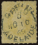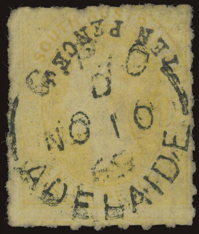 | Zusatzinformationen und Suchstichworte: | 249. Abacus Auktion 9. - 12. November 2022 Los 1103 Südaustralien TEN PENCE: 'TEN PENCE' in Black on 9d yellow with the Surcharge Inverted at the Top SG 37a with Overprint Sub-Type 3 ('T' of 'TEN' almost horizontal & 'N' of 'TEN' close to vertical), full rouletting and one of the few well centred examples, a little aged, 'G.P.O/NO10/69/ADELAIDE' cds largely clear of the surcharge, Cat £7500. An attractive example of this famous error of which 'Shilling Violet' No 16 (Sep 1989) recorded a mere 15 known (not including Peter Jaffé's unique pair). Ex Colonel Harry Napier (but not the stamp offered in his auction of 11.5.1976). RPSofL Certificate (1965) unkindly states "stained". More attractive than Michael Blake's off-centre example - the surcharge misplaced & partly off the stamp - that sold for $10,485 Ausruf 3.800,00 AUD |