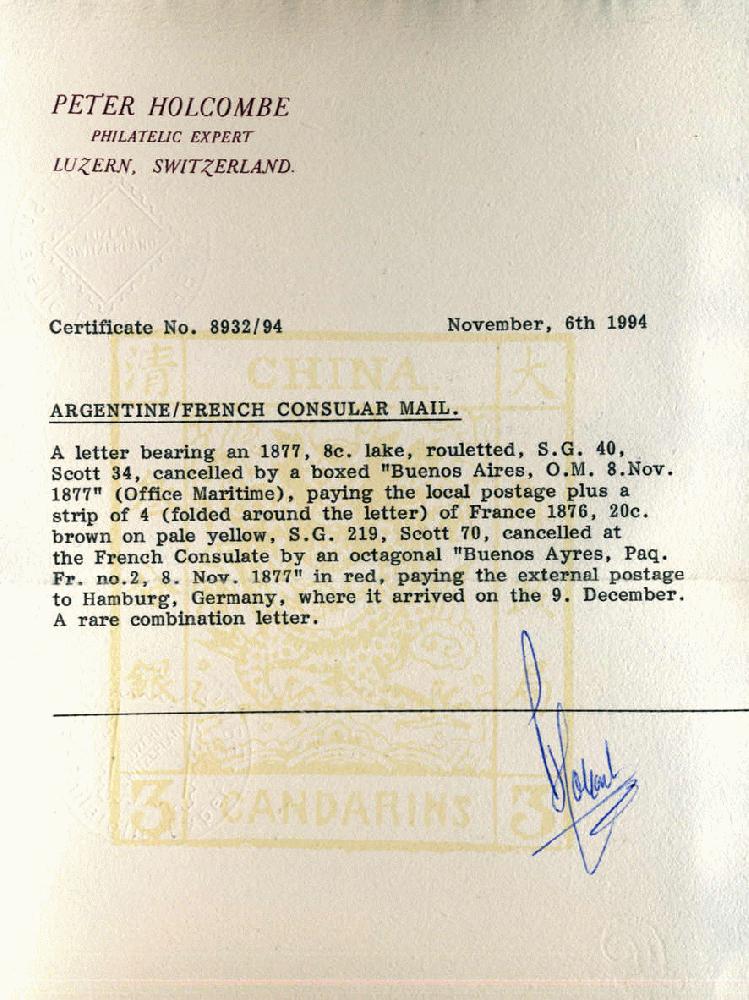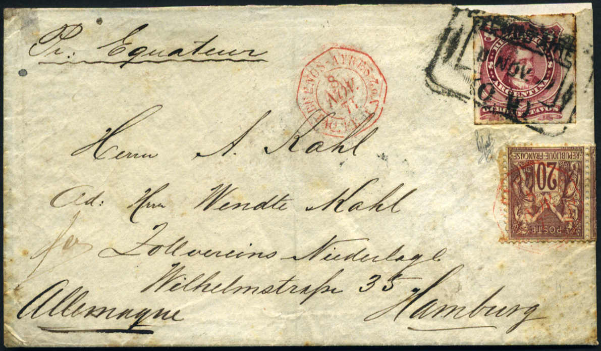 | Zusatzinformationen und Suchstichworte: | 75. AAK Phila GmbH Auktion 9. September 2022 Los 6 (D) Argentinien 8 C B. Rivadavia per Konsulatspost auf gefaltetem Bedarfsbf. (Altersspuren) als Lokalpostgebühr v. Buenos Aires, weiter m. 4x 20 C Frankreich Allegorie um den Brief geklebt als intern. Porto (80 C) n. Hamburg m. Leitvermerk "Per Equateur" m. FA Holcombe "a rare combination letter" Ausruf 500,00 EUR |