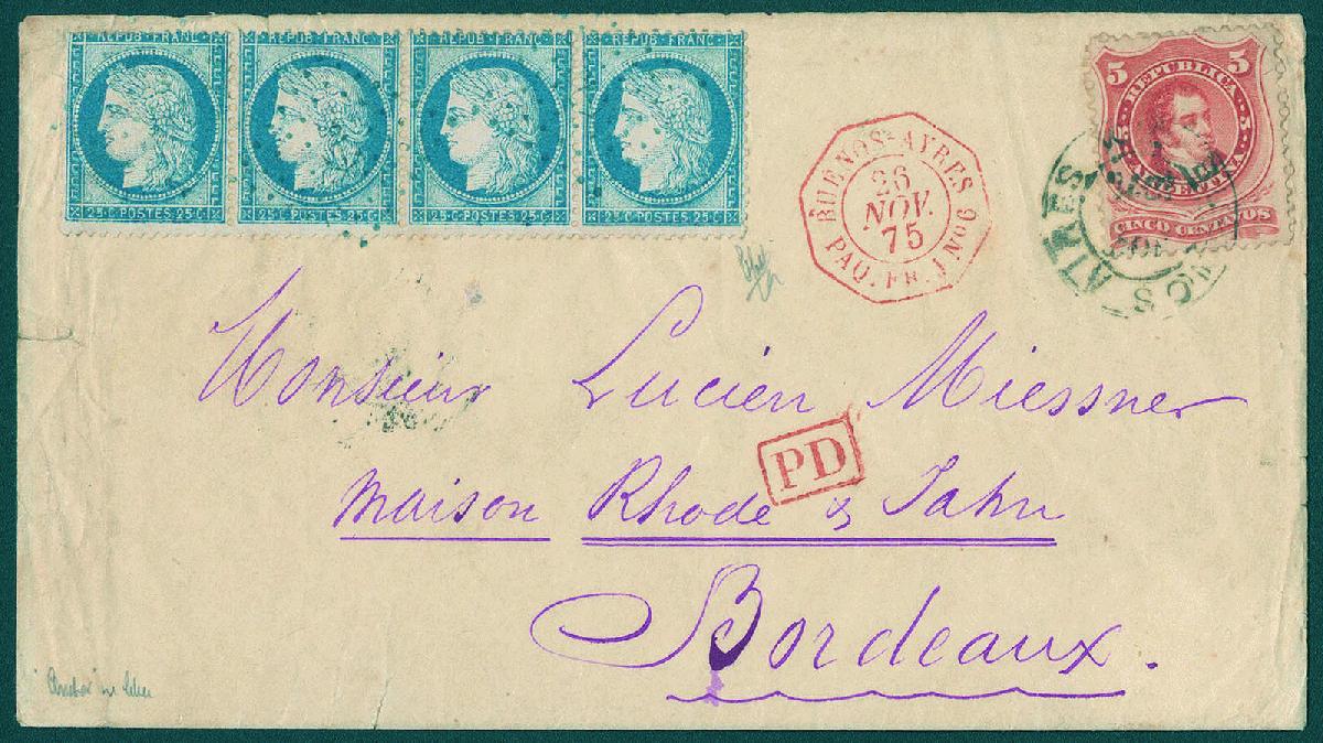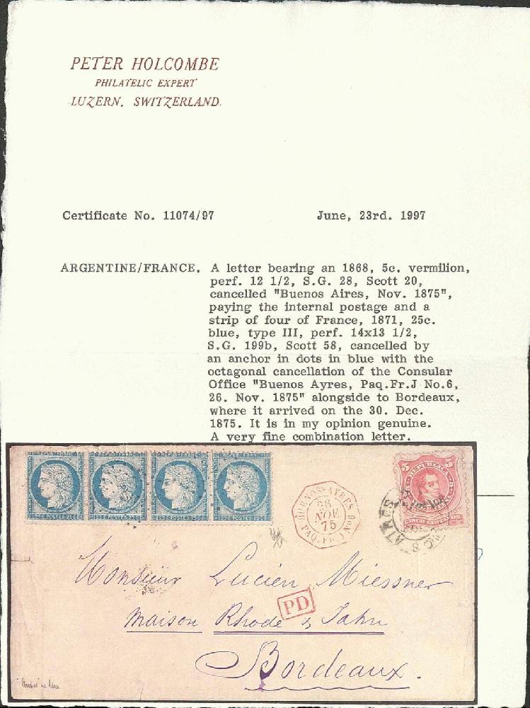 | Zusatzinformationen und Suchstichworte: | Gert Müller 115. Auktion 25. - 27. August 2022 Los 2503 Argentinien 5 C. ziegelrot, gekreuzter Grund, farbfrisch und tadellos in seltener Doppelfrankatur mit Frankreich 25 C. Ceres im waagerechten Viererstreifen auf Brief mit K2 "BUENOS AIRES" mit beigesetztem rotem Konsularstempel "BUENOS AYRES PAV.FR.J NO.6 26.NOV.1875", die französische Frankatur mit Ankunftsstempel mit Punkten entwertet. Die argentinische Frankatur bezahlte das Inlandsporto, wogegen die französische Frankatur für das Auslandsporto bis Bordeaux verwendet wurde. Eine dekorative und in dieser Form außergewöhnliche Frankaturkombination! Fotoattest Peter Holcombe Ausruf 1.200,00 EUR |