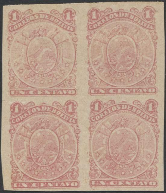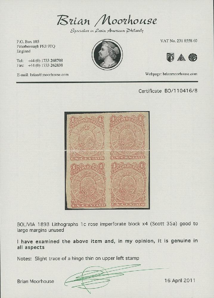 | Zusatzinformationen und Suchstichworte: | Ulrich Felzmann 34. e@uction 5. - 9. September 2022 Los 12010 Bolivien 1893, 1 C coat of arms imperf. block of four, mint no gum with slight trace of a hinge thin on upper left stamp, otherwise very fine with good to large margins all around, cert. Moorhouse (Sc. 35a) Ausruf 60,00 EUR |