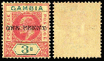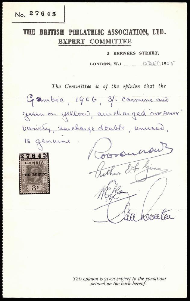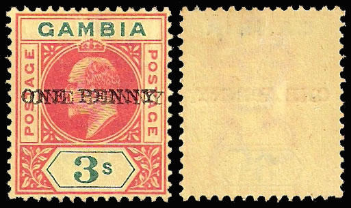 | Zusatzinformationen und Suchstichworte: | Filat AG Shop Neu Los 1397 (D) Gambia 1906 KEVII 1d on 3/- SURCHARGE DOUBLE (SG 70a). A VF/M well-centered example with nicely separated impressions of the double surcharge. Fresh, barest traces previous hinging. A rare stamp. Photo-cert: BPA. (cv£1800). See clickable image of certificate below Festpreis 2.350,00 CHF |