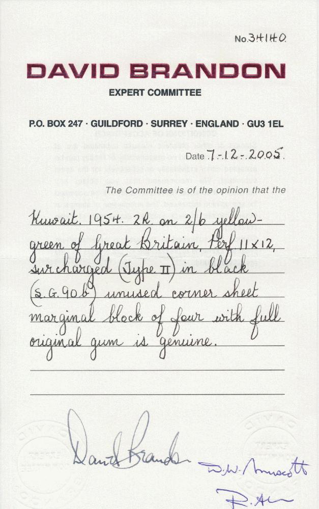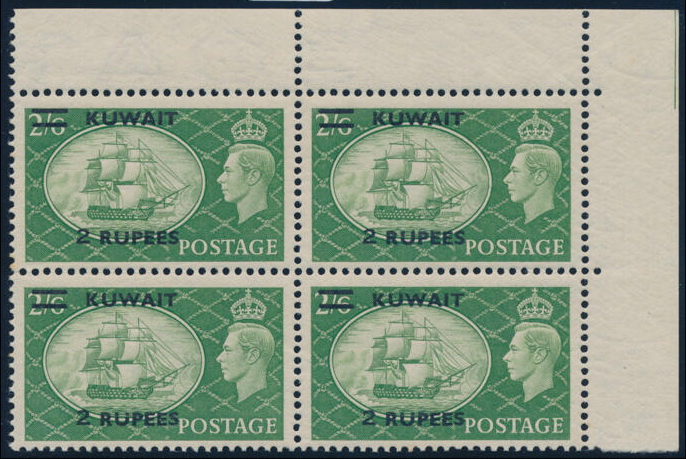 | Zusatzinformationen und Suchstichworte: | Doreen Royan & Associates Shop - Online Los 751209 (D) Kuwait 1954 King George VI 2R. on 2/6d. yellow-green. North East corner block of four. Variety, ‘Surcharge Type II (on all four stamps)’. Superb unmounted mint condition. Brandon Certificate No. 34,140 (2005). RARE MULTIPLE Festpreis 1.200,00 GBP |