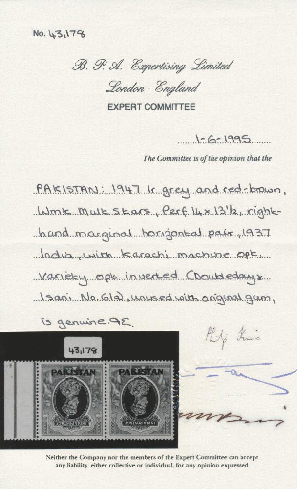 | Zusatzinformationen und Suchstichworte: | Doreen Royan & Associates Shop - Online´ Los 750856 (D) Pakistan Pakistan 1947 King George VI 1R. grey and red-brown. Right marginal horizontal pair with Variety, ‘Overprint inverted’ overprinted locally at Karachi’. SUM. British Philatelic Association Certificate No. 43,178 (1995). RARE Festpreis 500,00 GBP |