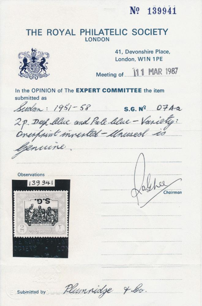 | Zusatzinformationen und Suchstichworte: | Doreen Royan & Associates Shop - Online Los 751320 (D) Sudan Sudan 1951 King George VI Official. 2p. deep and pale blue. Variety, ‘Overprint inverted’. Superb unmounted mint condition. Royal Philatelic Society Certificate No. 139,941 (1987). EXCEEDINGLY RARE Festpreis 900,00 GBP |