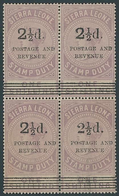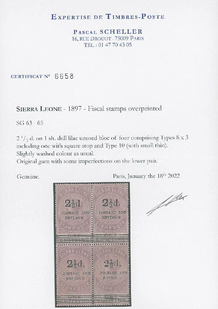 | Zusatzinformationen und Suchstichworte: | Ulrich Felzmann 34. e@uction 5. - 9. September 2022 Los 12280 Sierra Leone 1897, 1 S Stamp Duty with 2½ d. overprint in different types, unused block of four, mint hinged with some imperfections on the lower pair, slightly washed colour as usual, scarce combination of Type 8 with round stop x 2, Type 8 with square stop and Type 10, little thinned, cert. Scheller (SG 63+65) Ausruf 100,00 EUR |