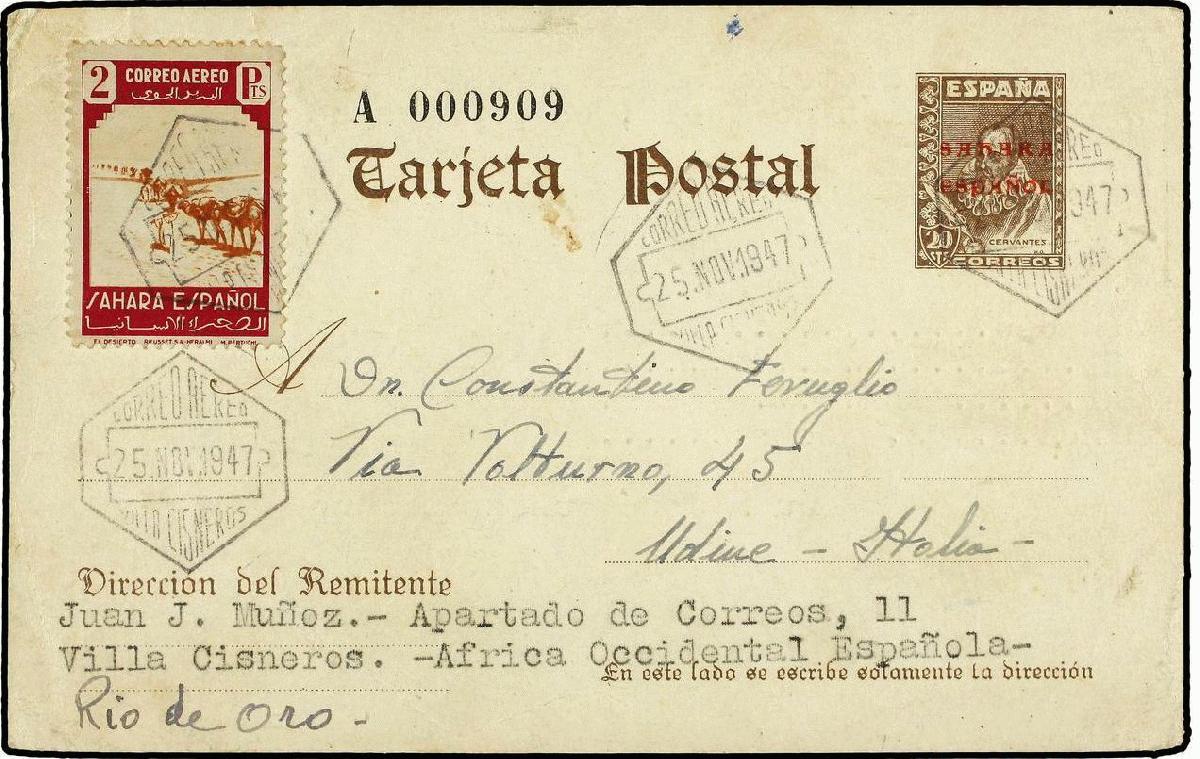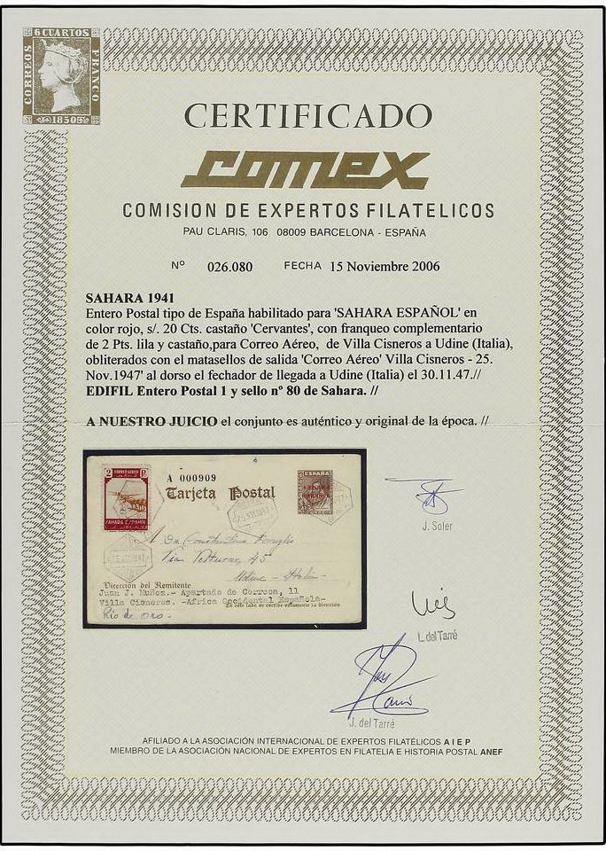 | Zusatzinformationen und Suchstichworte: | Soler y Llach - 779. Auktion - Spanien und Kolonien 17. - 18. Oktober 2022 Los 1518 Spanisch Sahara COLONIAS ESPAÑOLAS: SAHARA. 1947. VILLA CISNEROS a UDINE (Italia). Entero Postal de 20 cts. castaño habilitado SAHARA/ESPAÑOL con franqueo adicional de 2 pts., circulado por Correo Aéreo. EXTRAORDINARIAMENTE RARO verdaderamente circulado, no se conocen más de 3 ó 4 ejemplares. Al dorso fechador de llegada. Cert. COMEX. Ausruf 1.200,00 EUR |