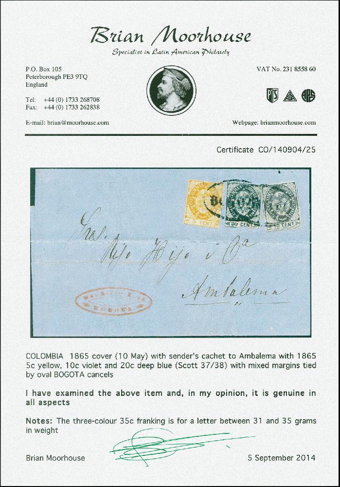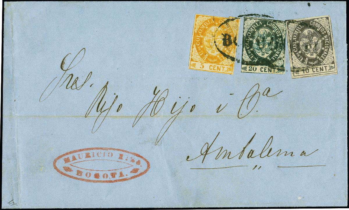 | Zusatzinformationen und Suchstichworte: | Heinrich Köhler 379. Auktion 19. - 24. September 2022 Los 1604 Kolumbien 1865, 5 c. yellow, 10 c. violet and 20 c. deep blue, fresh colour, 20 c. touched in places, otherwise full to large margins, tied by oval black "BOGOTA" to letter sheet to Ambalema. A very fine and fresh 3 colour franking for a letter between 31 and 35 g in weight. A rare entire. Certificate Moorhouse (2014) (Scott37-39) Zuschlag 2.300,00 EUR |