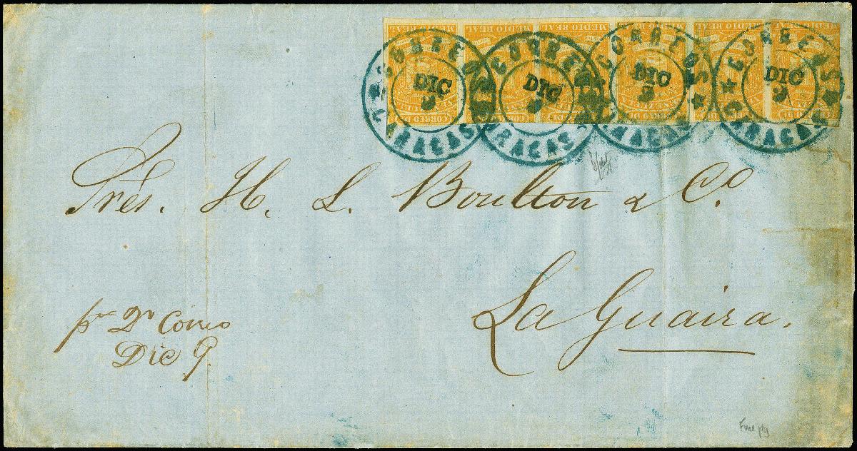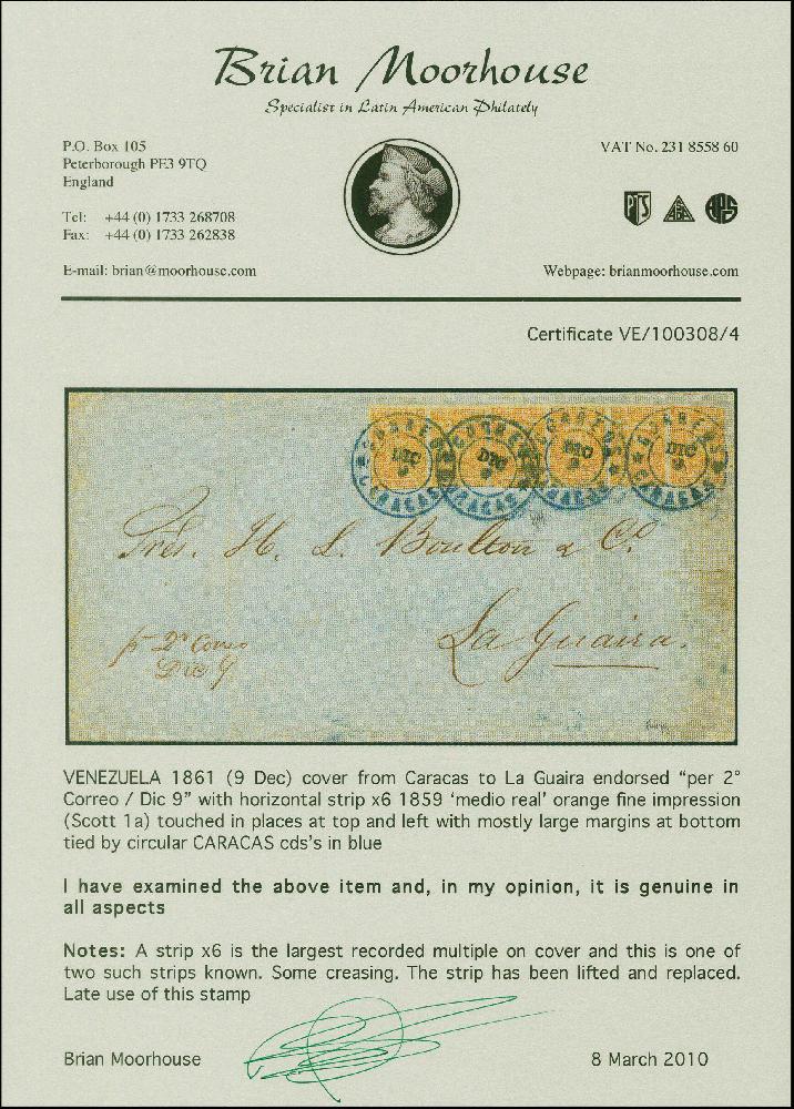 | Zusatzinformationen und Suchstichworte: | Heinrich Köhler 379. Auktion 19. - 24. September 2022 Los 1680 Venezuela 1859, Fine printing 1/2 r. orange in horizontal strip of 6, very deep vivid colour, touched in some places, otherwise clear to large margins, tied by 4 good strikes of blue cds. “CORREOS CARACAS DIC 9” to letter sheet to La Guaira. Some light creasing, strip has been lifted and remounted, otherwise fine. The largest multiple of this stamp on cover (one of only two recorded) and very late usage of this stamp. Certificate Moorhouse (2010) (Scott1a) Ausruf 3.500,00 EUR |