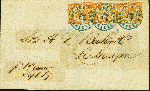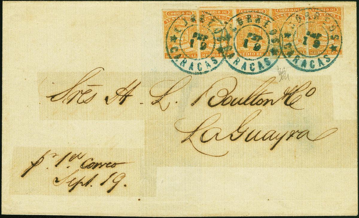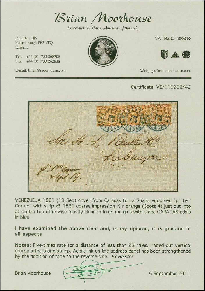 | Zusatzinformationen und Suchstichworte: | Heinrich Köhler 379. Auktion 19. - 24. September 2022 Los 1684 Venezuela 1861, coarse printing 1/2 r. orange, horizontal strip of 5, nice vivid colour, just cut into at centre top, otherwise clear to large margins, tied by blue cds. “CORREOS CARACAS SEP 19” to letter sheet to La Guaira. One stamp with crease, acidic ink on the adress panel has been strengthened by the addition of tape to the revers side, otherwise fine. A very scarce franking. Certificate Moorhouse (2011) (Scott 4) Ausruf 1.500,00 EUR |