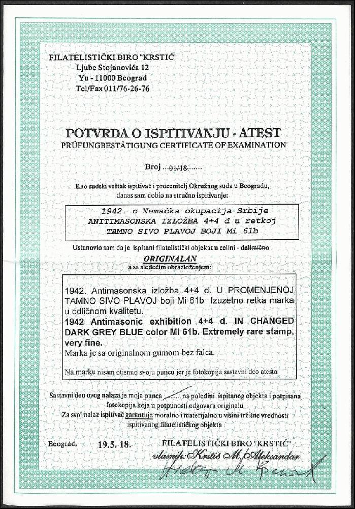 | Zusatzinformationen und Suchstichworte: | 55. SFK Auktion 22. - 23. Oktober 2022 Los 691 Kein Gebiet zugeordnet 1942. Antimasonska izložba 4+4 U PROMENJENOJ TAMNO SIVO PLAVOJ boji Mi 61b 2500.-€ katalog. Izuzetno retka marka u odličnom kvalitetu. Retka prilika za vrhunskog sakupljača. Foto atest Krstić. 1942 Antimasonic exhibition 4+4 IN CHANGED DARK GREY BLUE color Mi 61b 2500€ catalog value. Extremely rare stamp, very fine. Rare opportuniti for supreme collector, photo certificate Krstic Ausruf 190,00 EUR |