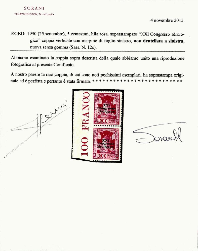 | Zusatzinformationen und Suchstichworte: | 75. Viennafil Live-Auktion 29. November - 2. Dezember 2022 Los 862 Ägäische Inseln 1930, 5 cent. lilla rosa soprastampato "XXI Congresso Idrologico", non dentellato a sinistra, bordo di foglio, nuovo senza gomma, raro e molto ben conservato, fotocopia cert. Sorani per la coppia da cui proviene (Sass. 12c, € 1.800) Ausruf 200,00 EUR |