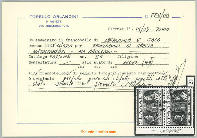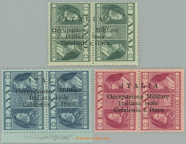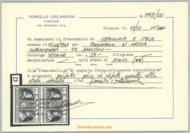 | Zusatzinformationen und Suchstichworte: | Burda 69. Auktion 10. - 11. September 2022 Los 112 Ionische Inseln 1941 CEFALONIA and ITHAKA - Sass.29, 30d, 31; Greek 10L+10L, 50L+50L and 1Dr.+1Dr with overprint ITALIA Occupazione Militare Italiana ISOLE .....; very fine, 2x certificate T. Orlandini, stamp 50L+50L with INVERTED OVERPRINT (Sass.30d), c.v.. 5.600EUR; rare Ausruf 1.120,00 |