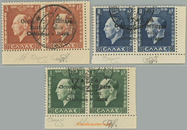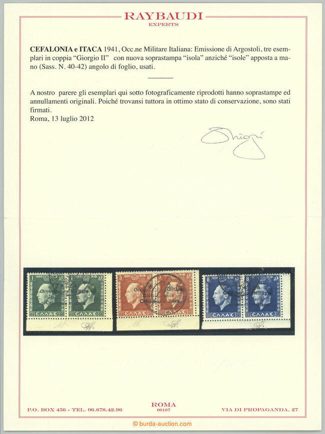 | Zusatzinformationen und Suchstichworte: | Burda 69. Auktion 10. - 11. September 2022 Los 114 Ionische Inseln 1941 CEFALONIA and ITHAKA / Sass.40-42, Greek 3Dr+3Dr - 8Dr+8Dr, complete set with overprint ITALIA Occupazione Militare Italiana ISOLA .....; very fine, exp. Diena and oths., certificate Raybaudi, c.v.. 1.500EUR Zuschlag 240,00 EUR |